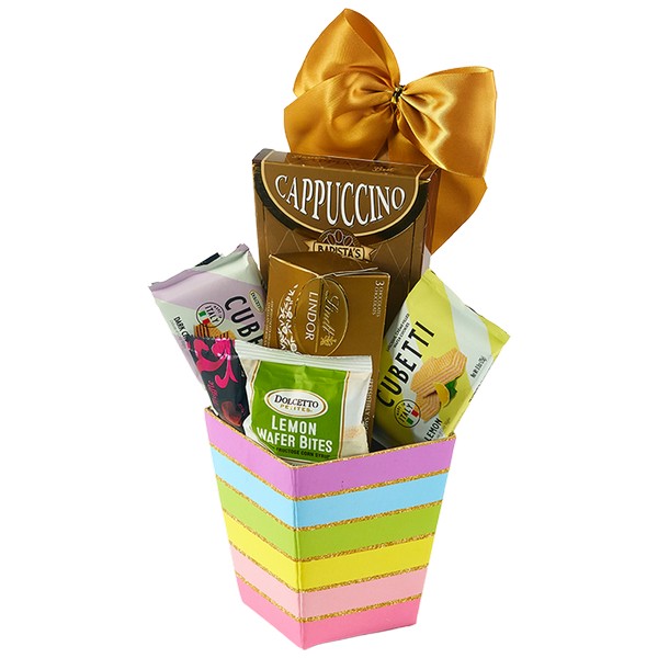• Description: 6 items: Lindt Lindor Assorted Truffles 36g, Barista’s Best Cappuccino 28g, Dolcetto Cubetti Wafers Dark Chocolate 25g, Dolcetto Cubetti Wafers Lemon 25g, Truffettes de France Truffles 7.5g, Dolcetto Lemon Wafer Bites 20g. *GIFT BASKETS ARE DRESSED IN CELLO AND BOW*