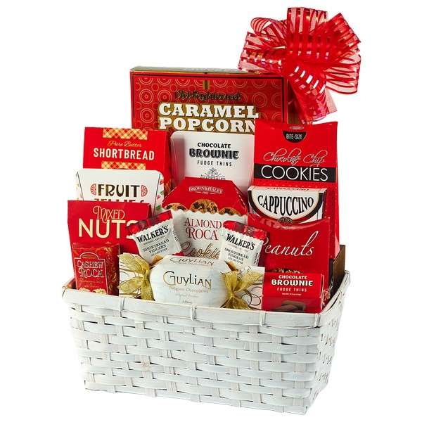 • Description: 15 items: Brown & Haley Almond Roca Cookies 57g, Brown & Haley Cashew Roca 11g, Walker’s Shortbreads 40g (2 pcs), Guylian Belgian Truffles 33g, Comfort Collection Popcorn 160g, Aunt Gloria’s Shortbread 57g, Snacktales Choc Brownie Fudge Thins 56g, Sonia’s Favourite Cookies 57g, Pizzaz Fruit Jellies 84g, Barista’s Best Cappuccino 28g, Snacktales Premium Mixed Nuts 40g, Snacktales Honey Roasted Peanuts 40g, Snacktales Choc Brownie Fudge Thins 14g, White Bamboo Basket (14’’). *GIFT BASKETS ARE DRESSED IN CELLO AND BOW*